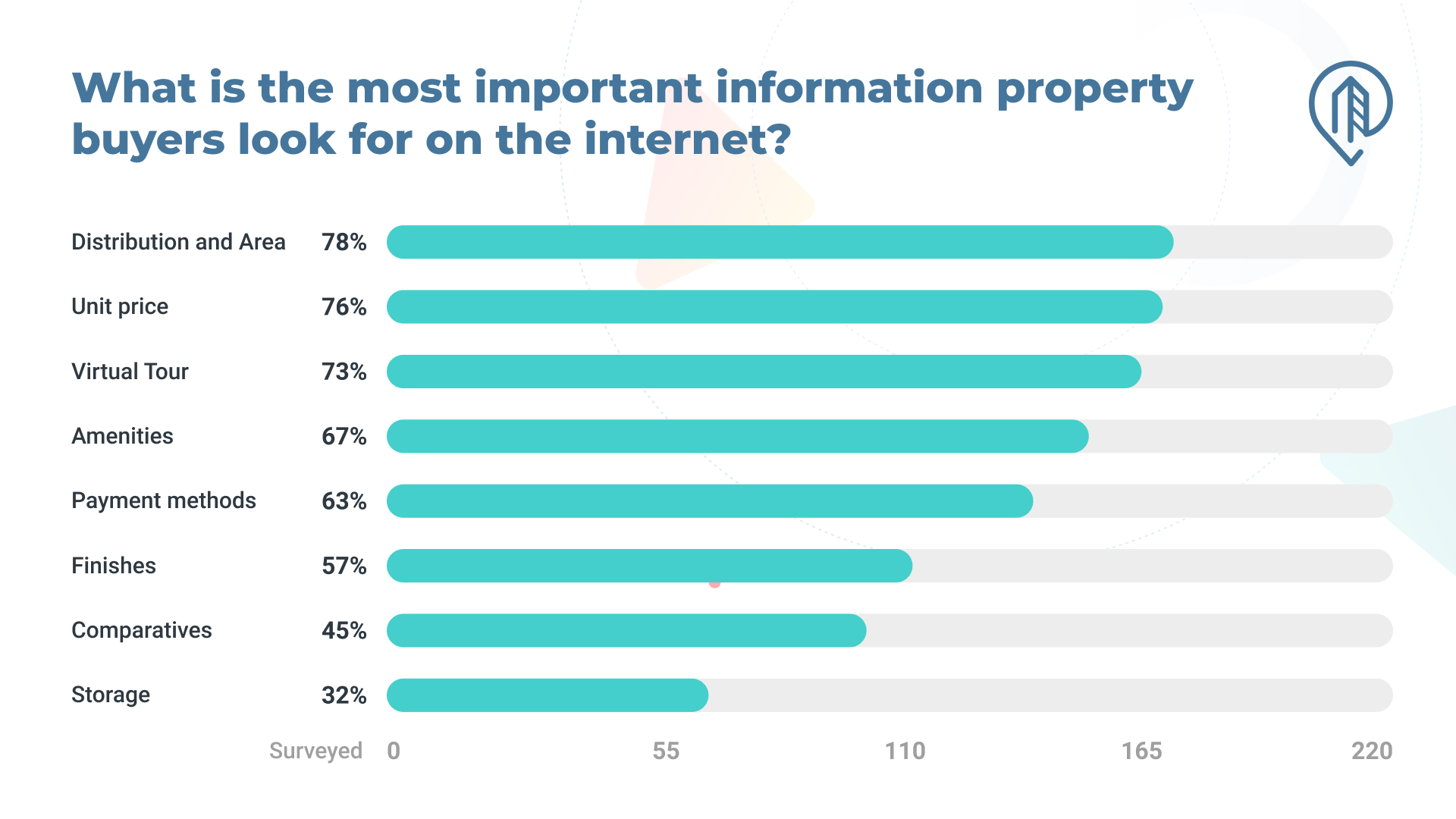 According to a survey conducted by our friends at 4s Real Estate, the #1 consultancy firm specializing in real estate development in LATAM, this is the most important information property buyers look for on the internet.