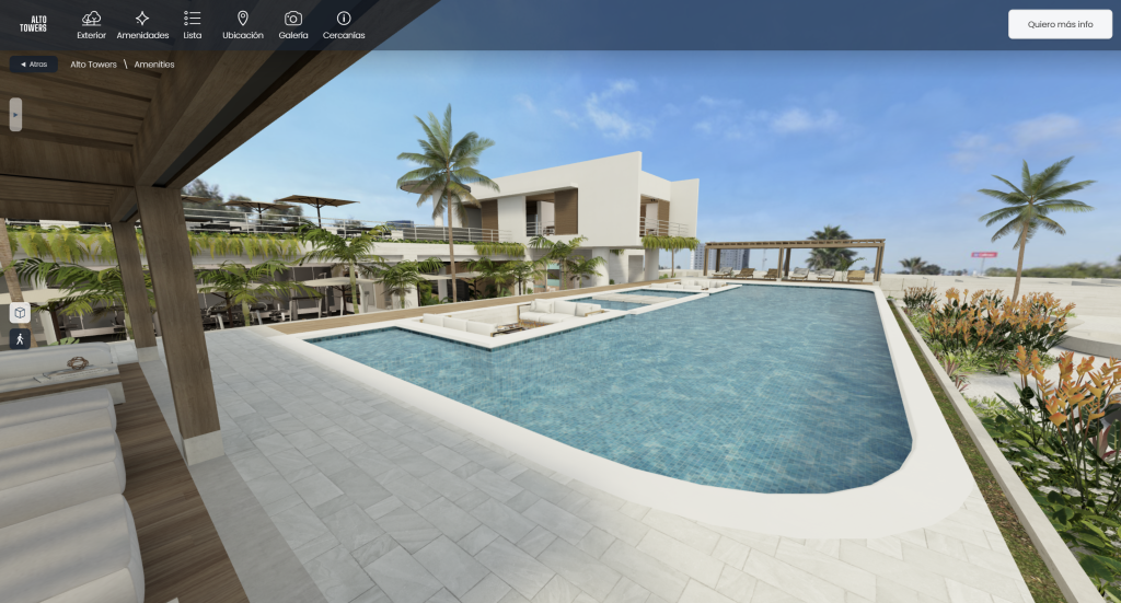 El cliente explora áreas comunes, jardines y alberca mediante un Tour 3D interactivo.